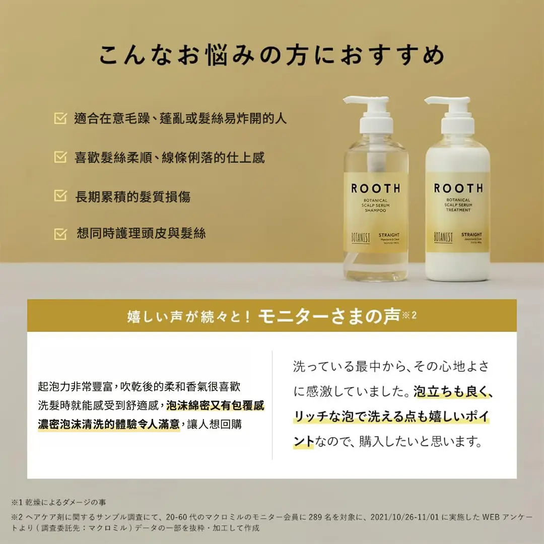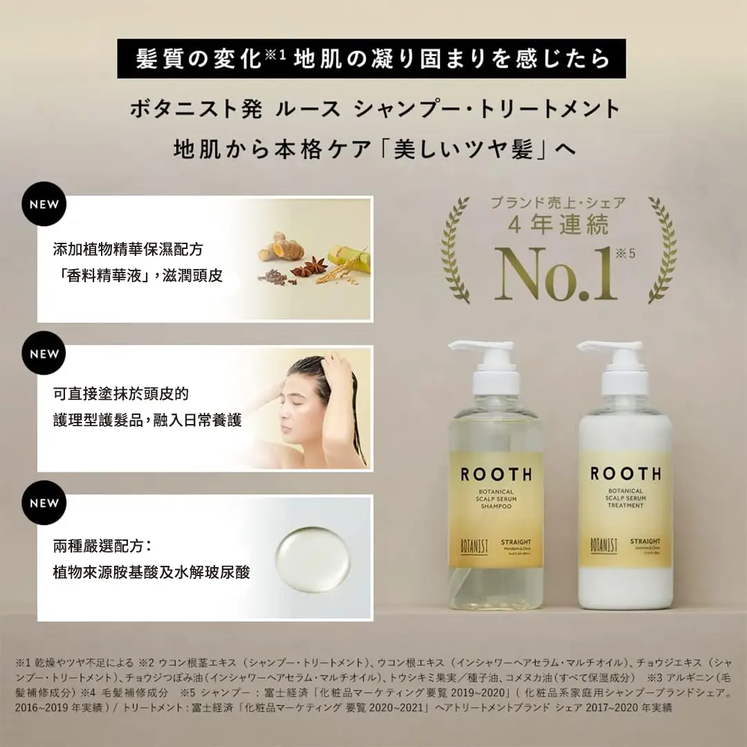 | 款式 | ROOTH|洗髮乳, ROOTH|護髮乳, ROOTH|修復精華, ROOTH|髮油, ROOTH|洗髮乳 補充包, ROOTH|護髮乳 補充包, BOTANIST|瞬效髮膜, BOTANIST|玫瑰 洗髮乳 |